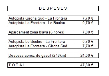 Trajecte d'Anglès fins a Colliure, amb visita el Fort Saint-Elme. (anada i tornada). El preu de la despesa és aproximada i calculada segons "Via Michelin" a 1,329 €/l de gasoil. Colliure ofereix una amplia oferta gastronòmica amb diversitat de restaurants on escollir. Nosaltres varem dinar al restaurant l'Insolite, just al costat mateix de l'església de Notre Dame des Anges. Podent escollir un menú de 18 euros, un de 30 euros o anar a la carta. Val la pena menjar-hi peix fresc, tot estava boníssim i la presentació més que correcte (fotos adjuntes). A més, ens varen invitar a un got de vi verd, mentre esperaven que ens donessin taula.